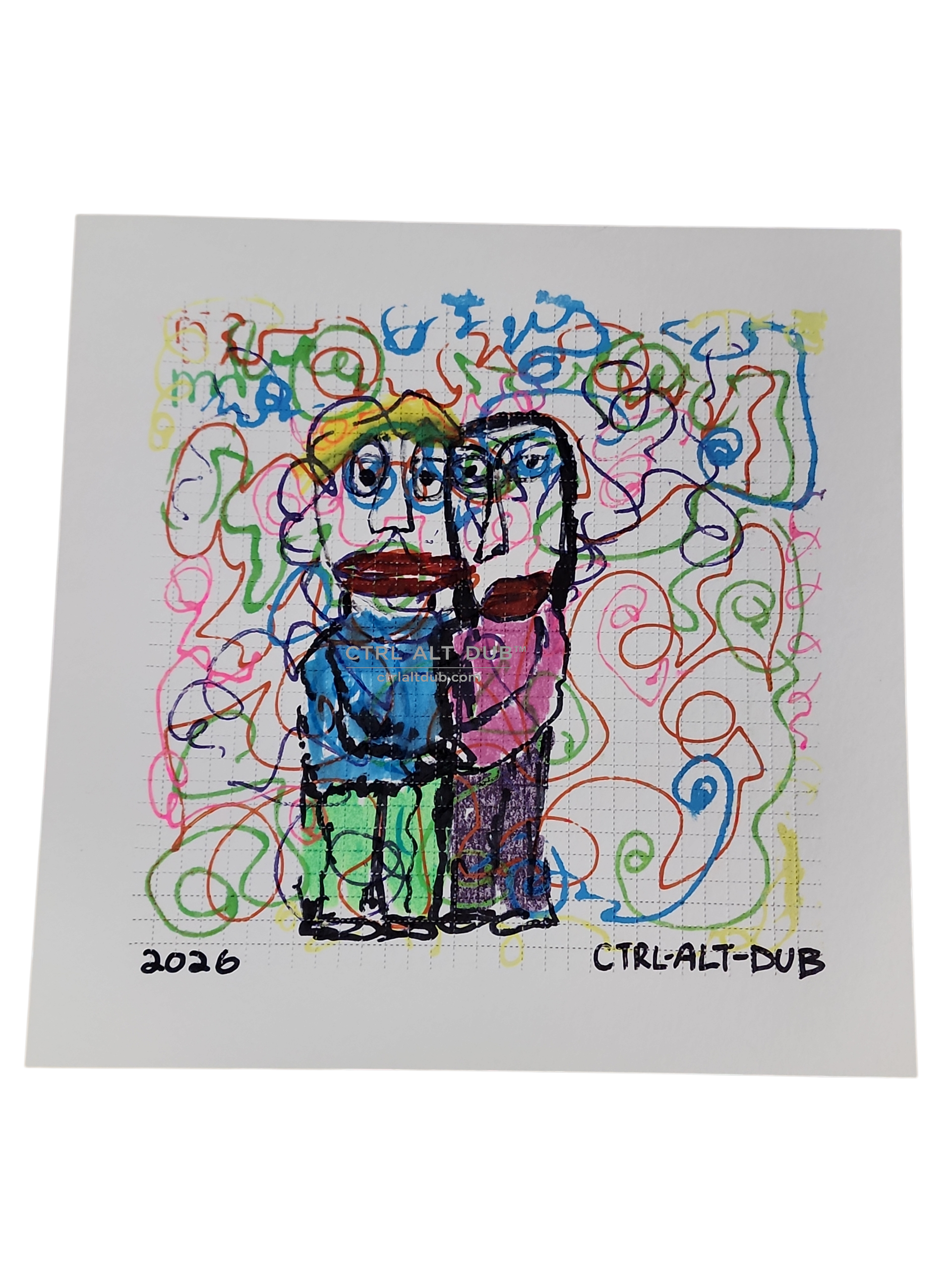 Original 10 × 10 inch drawing on perforated LSD blotter art paper by CTRL ALT DUB, created with India inks and markers. Two abstract figures rendered in bold lines and vibrant color are surrounded by energetic, swirling marks across the blotter grid. Playful, expressive, and raw in style. A digital watermark appears on the image for online display only and is not present on the original artwork.