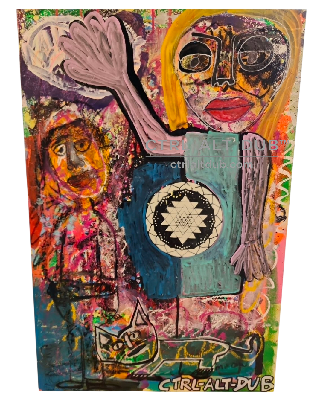 This CTRL ALT DUB mixed-media painting (24 × 36 inches) on stretched canvas presents a vibrant, intuitive composition that blends figurative imagery with raw abstraction and symbolic detail.